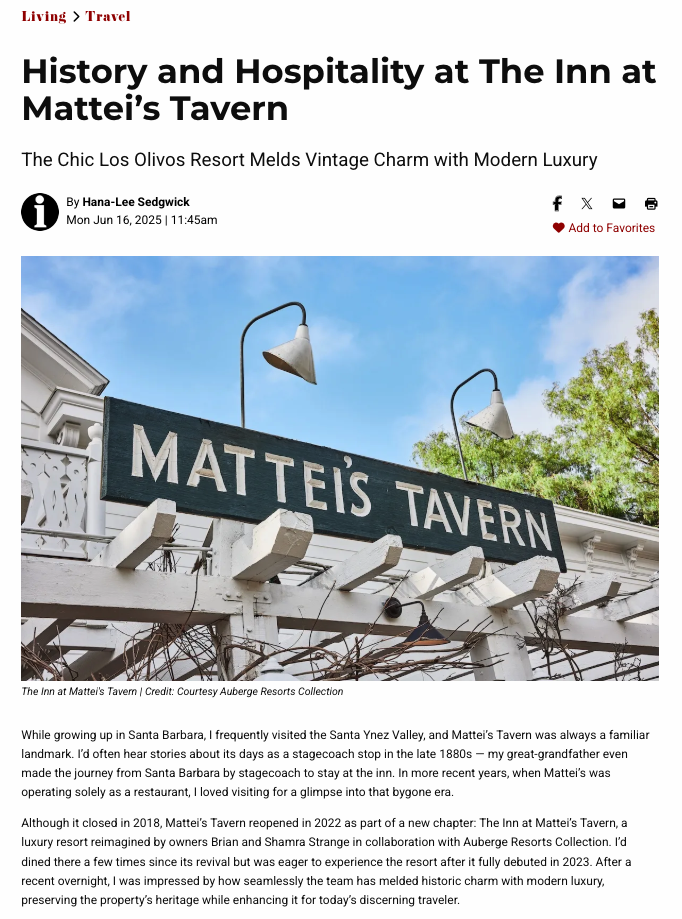 “Today, the spirit of Mattei’s lives on at The Inn at Mattei’s Tavern — a 67-room retreat just steps from the heart of Los Olivos. Even though it’s right in town, this luxury getaway doesn’t feel out of place. The resort’s low-profile, whitewashed buildings with red roofs echo the original architecture, blending seamlessly with the four historic cottages, now meticulously renovated.”